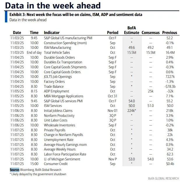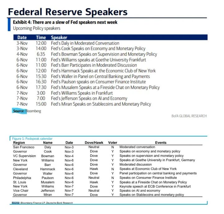 TBA/Whole Week: Worldwide October services and PMIs, U.S. Gov data expected to be delayed due to the shutdown, All eyes will also be on whether U.S. lawmakers can agree to end the shutdown, & Investors will be looking for any evidence of weakness in the labor market or evidence that inflation is slowing to increase December rate cut odds which has dropped to 50% from 99% after powell’s presser.