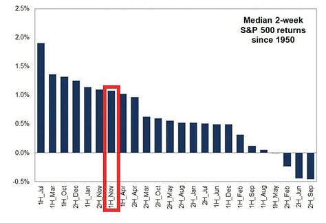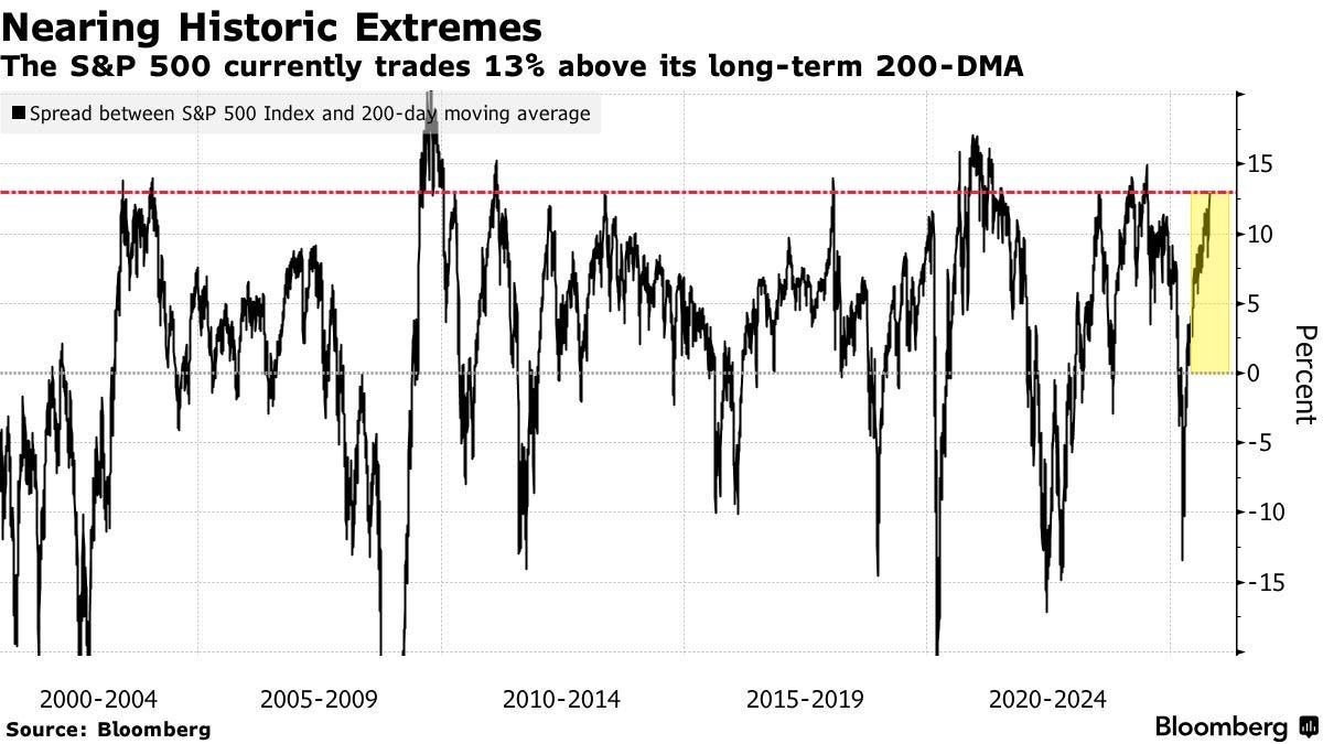 S&P 500 currently trades 13% above its tong-term 200-DMA, That wide of a spread has historically pointed to a selloff, which happened in 2011, 2018 and 2021, Bloomberg data show. BUT Also Over the past three decades, the S&P 500 has averaged a gain of roughly 2.5% in November, the strongest month for stocks on average, when compared with a 0.6% rise in the other 11 months, according to data compiled by Bloomberg.