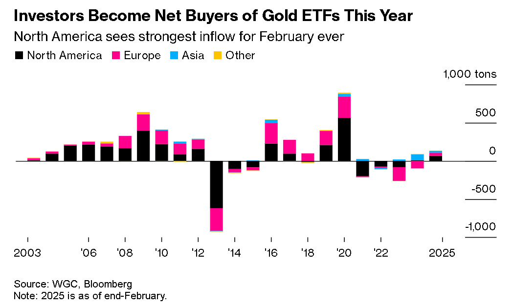 Gold: Investors are net buyers of physically-backed gold exchange-traded funds this year, after selling them for the past four years. North America saw a major inflow in February, the largest in a single month since July 2020: BBG