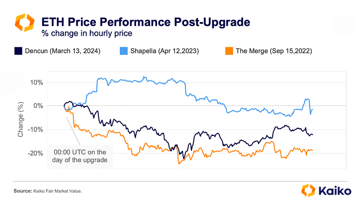 Will Pectra be enough to turn the tide for ETH? by kaiko: Over the past years, ETH has undergone several major upgrades without a hitch showcasing the network’s ability to evolve despite its growing size and complexity. However, none of them were a major price booster. In fact, most were “sell the news type of events” with prices down by 12% and 18% in the two-week period after Dencun and The Merge. Sophisticated traders are bearish for post upgrade period, with implied volatility skewing to the left. The largest skew is around the April 4 expiration, right around the time Pectra is expected to be on mainnet, and suggests large demand for hedging around this time. (upcoming Pectra upgrade is the largest in terms of EIPs)