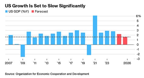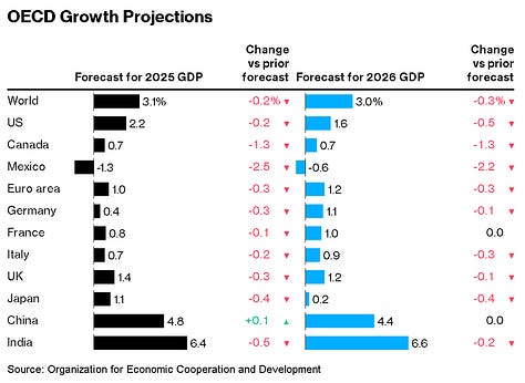 The OECD predicts the pace of global expansion to slow to 3.1% this year and 3% in 2026 due to trade barriers and uncertainty. The calculations don’t account for any of the other threats Trump has made, including a pledge of global reciprocal tariffs: BBG
