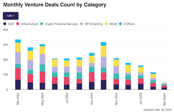 Funding: The monthly count of crypto venture deals has contracted significantly, with only 116 private deals tracked in February 2025, marking one of the lowest points in recent years. This represents a substantial decline from the 300+ deals recorded in October 2024 - a 60% drop within a 5-month period.: Theblock