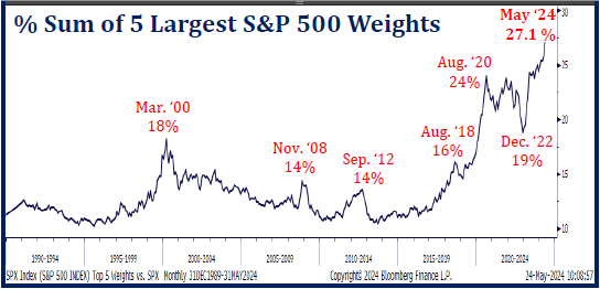 Top 5 holdings in S&P 500 (MSFT, AAPL, NVDA, AMZN, & GOOG) now = 27%+ of index's weighting That's highest % going back to 1980.